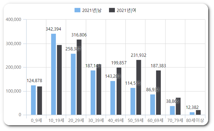 위 그래프는 발목 염좌로 병원에 내원하는 사람들의 추이를 나타낸 그래프입니다. 그래프를 보시면 주로 10 ~ 20대 인구에서 자주 염좌가 발생하는 것을 확인할 수 있는데요, 이는 신체 활동량도 많은 시기이고 스포츠 활동도 자주 할 시기이기 때문인 것으로 보입니다.