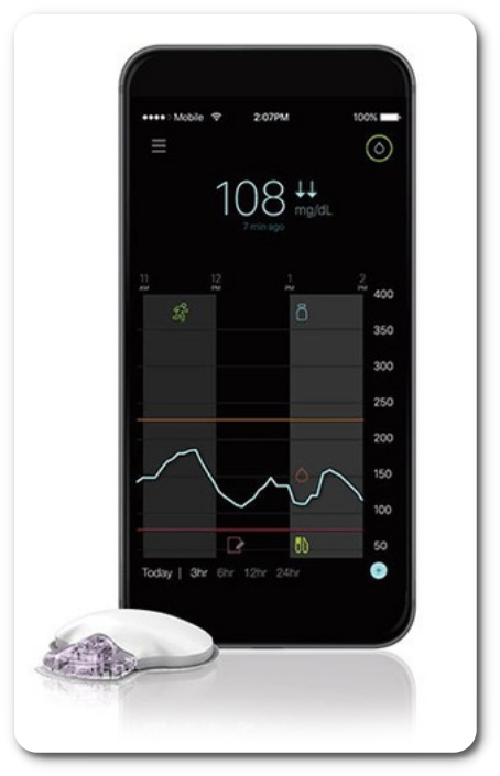 연속 혈당측정기란 '혈당 수치'와 '혈당 추세'를 실시간으로 확인할 수 있도록 해주는 기기를 말합니다. 기본적으로 별다른 채혈 과정 없이 피부 아래에 삽입한 센서를 통해 혈당 농도를 수시로 측정하여 스마트폰 앱 등의 수신기에 혈당값을 보여주지요.