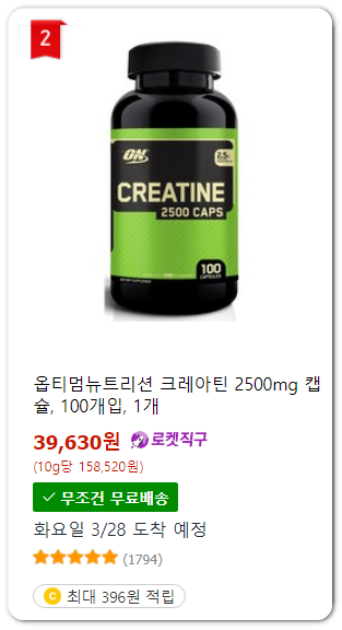 옵티멈 뉴트리션 크레아틴은 현재 쿠팡 판매량 2위를 차지하고 있으며, 해외 직구 치고 배송도 아주 빠른 편입니다. 가성비적인 측면에서는 중간 정도에 해당합니다.(위 쿠팡 상품에는 표기가 조금 잘못된 것 같은데 g당 가격 비교는 직접 사이트로 이동하셔서 하나 하나 비교해 보시는 것이 좋습니다)