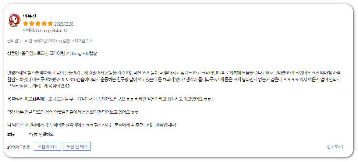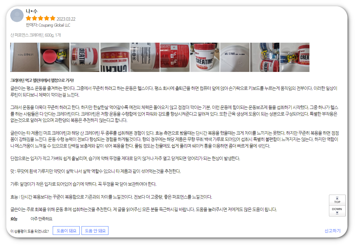 아래 링크로 이동하시면 위의 후기가 담긴 판 크레아틴 판매 페이지로 이동하실 수 있습니다. 타 사이트와 견주어 보더라도 쿠팡이 가장 저렴합니다. 쿠팡이 짱입니다.(로켓 와우 유저)